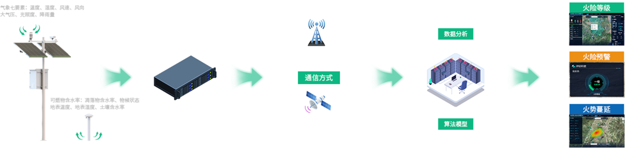结合气象数据、可燃物含水率、物候状态等因素,通过火险算法模型提前预测预警